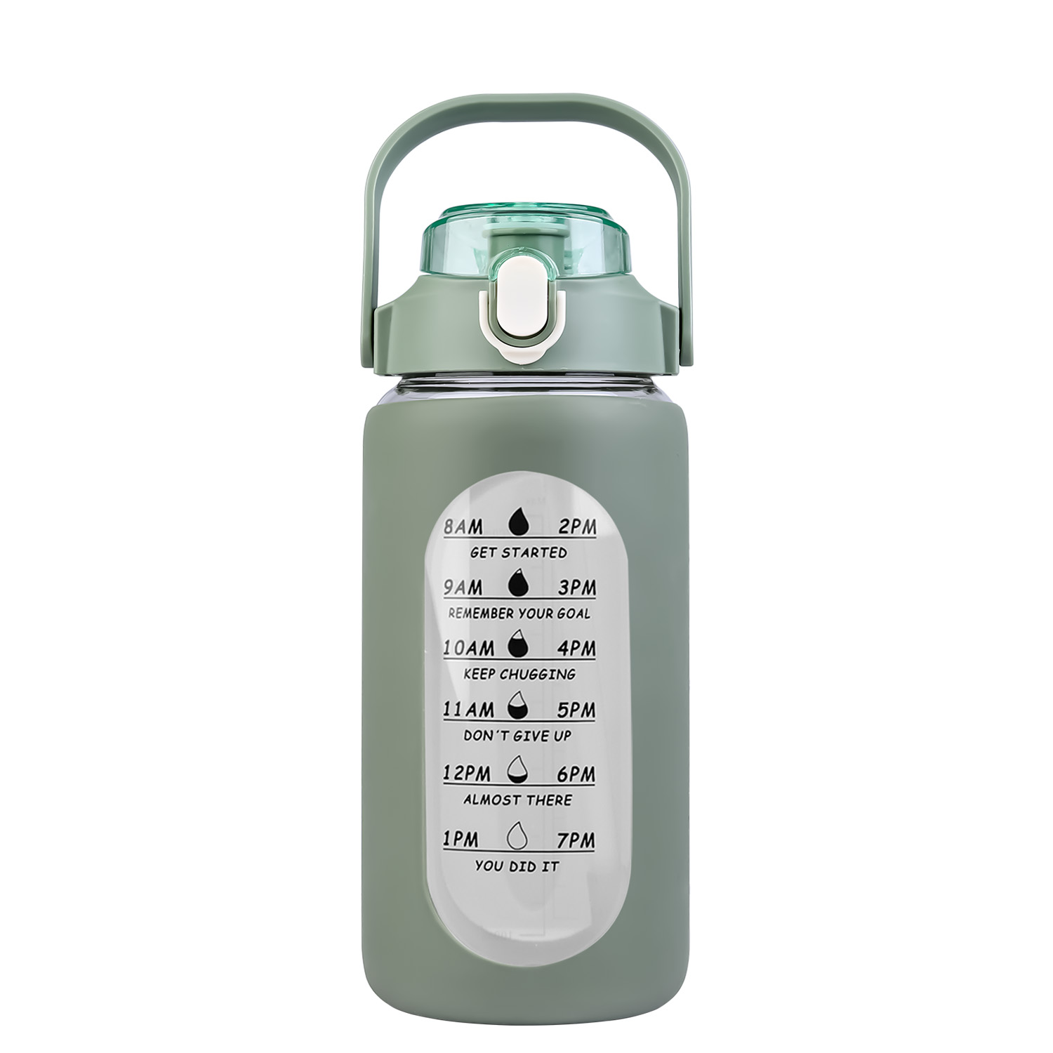 Are you tired of forgetting to stay hydrated throughout the day? Look no further than our motivational water bottle! Comes with timer markers and and precise volume on the side, helping you track your water intake with ease. With its large capacity(32Oz or 64 Oz), you can refill the sports water bottle up less frequently and keep yourself refreshed all day long. Made of high borosilicate glass, suitable for both warm and cold beverages, heat-resistant, dishwasher safe and healthy to use. Slip resistant with silicone sleeve and easy to carry with a built-in handle. And for added convenience, it features a built-in straw, making it easy to drink water on the go. Plus, its stylish design and motivational messages will inspire you to keep pushing towards your health goals. So why wait? Invest in our water intake tracker bottle today and take the first step towards a healthier, happier you!