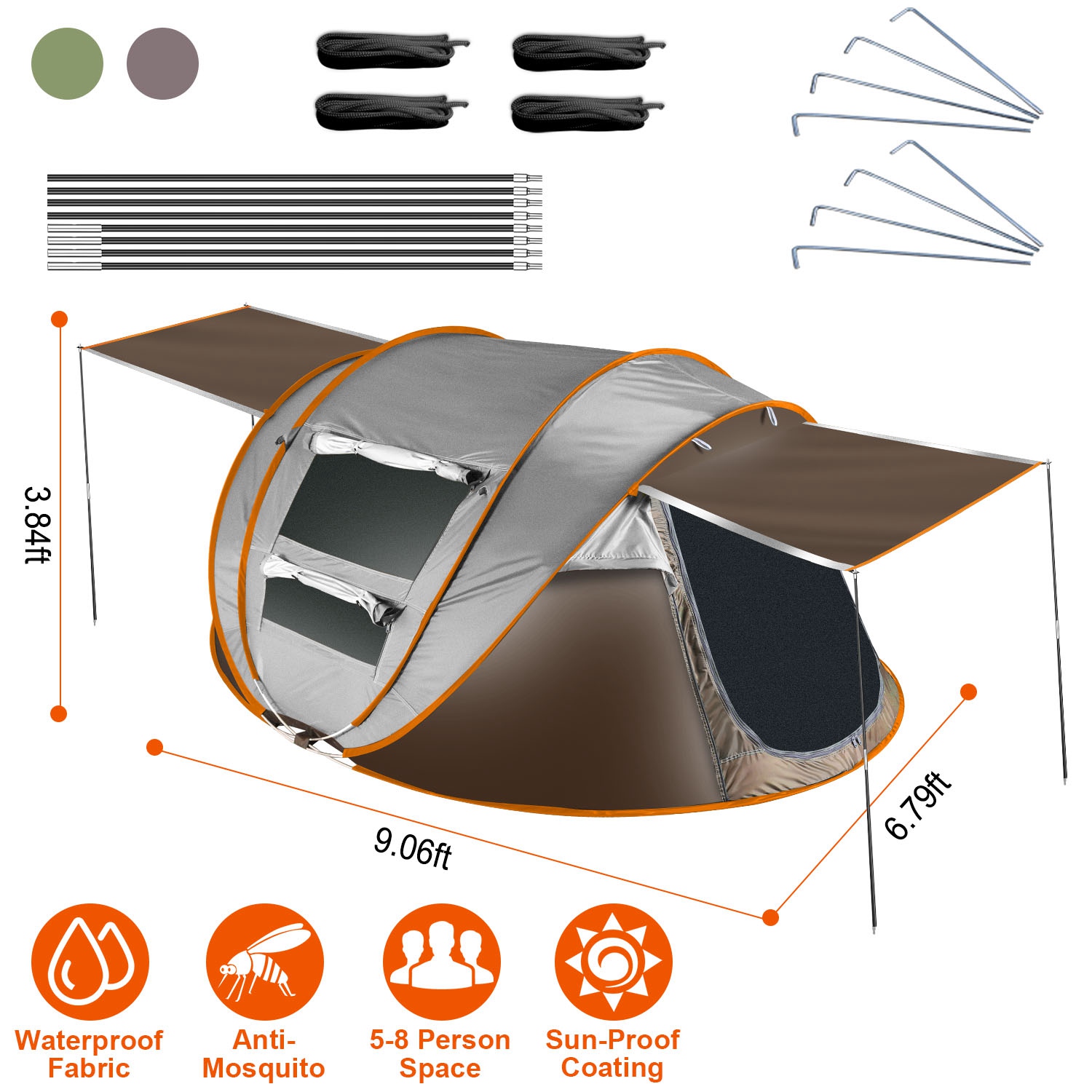 Our camping tent with unfolded size of 9.06x6.79x3.84ft, can hold up to 8 people, great for taking for travel with your families or friends. Designed with 4 symmetrical windows and dual doors with net and curtain, can effectively prevent mosquito and ensure excellent air circulation. Easy to set up by taking it out. It will auto open within 1 second. 4 Included tent poles allow you to prop up the front and back door cloth to create more shade to prevent sunburn. Designed with dual pockets inside for holding snacks or toys and hook on top for hanging a light conveniently at night for illumination. Comes with a carrying bag for quick storage and easy travel. Perfect for camping, hiking, climbing, etc..
